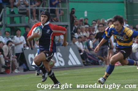 ワセダ先蹴でキックオフ。意思統一された選ばれし15人は、開始から見事な集中力を見せる。FWは激しく、強く、一歩も引かず(前半10分より出場した山岡正典の秘蔵っ子・松田純平、タックルしまくりでした…)。BKは速く、しなやかに、仕掛けて前へ。聖地・上井草で展開されたラグビーは、ワセダらしさに溢れていた。