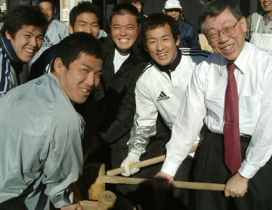 「お餅つき」は、縁起物でもありますので、選手・監督・ファンの方々とみんなで一緒につきました。そして、今日は、早稲田大学白井総長にもお越しいただき、部員と一緒に「よいしょ~よいしょ~」と声をあげてお餅つきに参加して頂きました。