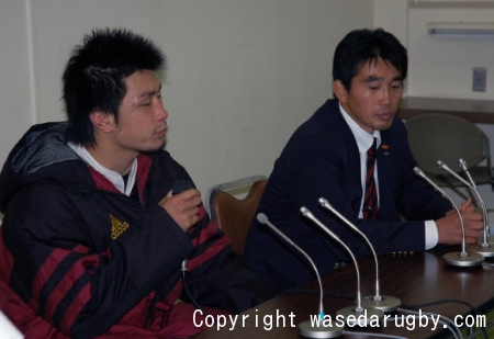 「前半はブレイクダウン、モール、近場を止められずに3本取られてしまった。帝京の圧倒的な個の強さに対して、学生たちは受けたつもりはないだろうけど、ジワジワいかれてしまった感じ。後半最初の2つ、ラインアウトモールをしっかり止められたのは修正できた証。その点は選手たちがよくやってくれた。モール、ショートサイドのアタックは帝京の持ち味。意識して練習してきたにも関わらず、いかれてしまったのは相手が強かったんだろうし、ワセダにも課題があるということ。まだ課題はたくさんある。ブレイクダウンではちょっとでも前にでられないと、相手はドンドンくるし、スイープで跳ね除けられずにテンポが出ない。相手が元気なうちに劣勢になってしまうのは課題。アタックに関しては、相手のディフェンスに対する修正がもっとできれば。今日はボールを動かすことがテーマだったけれど、1次2次でいいアタックができて、ビッグゲインにつながった。ターンオーバーからの切り返しの意識もよかった。テンポを上げるべきところが意識できてきてるかなと。でも、精度はもっともっと上げられる。前半苦しい展開を招いてしまったのは、中盤で攻めるのか、陣地を取りにいくのかが中途半端になってしまったから。そこは今一度見直したい。エリアの考え方うんぬんというか、行き方をどうするか、そこでの状況判断がよくなかった。前半終わって3点差だったけど、取られていたのはFWだったし、ペナルティしてるからだったし、内容的にはそんなに悪い感じはしていなかった。もっとディフェンスで仕留めて、もっとモールディフェンスをしっかりして、先手を取る。そういう意識でいたし、ロッカーに帰って来た学生たちもまだまだって雰囲気があった。(隣の後藤に対し)ねぇ? 途中で入れ替えた選手たち、特に松田は期待どおり、それ以上のプレーをしてくれた。らしいディフェンスをしていたし、ヒットした後も前に出ていた。3列はみんなきちっとしていて、チームとしては大きい。今年はリザーブの選手たちがしっかりと支えてくれている。次の早慶戦は、春に負けているし、夏は勝ったけれど相手は相当手応えあると言っていた。ゲームプランはどうなるか分からないけれど、真っ向勝負したい。そういう気持ち。とにかく明日からは、慶應だけを見てチャレンジ。春夏ともかなり点数を取られているから、今一度原点に返って、ディフェンディングラグビー。夏合宿の成果、その後走り込んだ成果を見せたい。慶應はランザボールを掲げているし、ボールを動かしあう展開が楽しみだね」