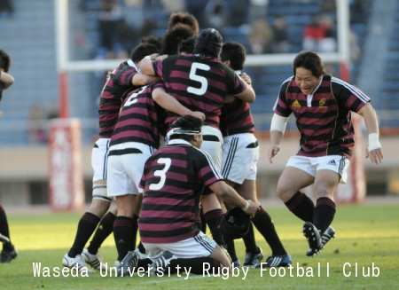 「相手が帝京さんに決まった日から、すごいチャンスが巡ってきたと、ずっとワクワクしていました。途中でしんどいこともたくさんありましたけど、中竹さんとなら乗り越えられると思いましたし、みんなも背中を押してくれたので、乗り越えることができました。スクラム選択については…、まぁ3点より7点の方がいいかなって(笑)。試合の展開については、入りは相手も強いですし、体も大きいですし、元気なうちは前にでることができませんでしたけど、徐々に慣れて、ワセダもしっかり戦えたと思います。ディフェンスをしていても取られる気はまったくしなかったですし、大丈夫だって。敵陣のチャンスでどうするかをみんなで考えてました。トライもそうして落ち着いてプレーしていたなか、取れたと思います。自陣から点を取ってやろうだなんて思ってなかったですし、敵陣に行ってスコア、自陣ではディフェンス。落ち着いてプレーできました。アップは…、行く前はみんなイライラしてましたね。僕が何を言っても、みんな帝京のことしか頭になくて、これはダメだって(笑)。宮澤とか目がおかしかったですから。けど、4年生がバックを持ってくれたことで、変われたのかなと思います。<以上記者会見> やばいっす!マジやばいっす!(笑)。今日は自分が2つトライを取ることができましたけど、あれはスクラムを安定させてくれたりしたみんなの力があればこそです。僕ひとりの力ではありません(清宮監督の言葉を借りれば、「過去8年の決勝でもっとも活躍したキャプテン」!)。今日は帝京という強いチームと決勝を戦えて幸せでした。帝京がいたから、あの負けがあったから、僕たちはここまで来ることができた。帝京のみなさんには本当に感謝しています。あのスクラム選択は、僕たちの信念です。あれが『Dynamic Challenge』。瀧澤がメチャメチャ組みたそうな顔をしていたので、じゃあスクラムって。そこでいいスクラムを組んでくれて、瀧澤も顔を上げたらトライで最高と言ってくれて、嬉しかったです。今日はみんなで話していたとおりに、ワセダらしさを出せたと思いますし、僕たち『豊田組』らしさも出せたと思います。最後に取られるところも含めて(笑)。結果、『荒ぶる』を取ることができて本当によかったです。『荒ぶる』を歌っているときは、夢のなかにいるようでした。何かフワフワしてました。『荒ぶる』を歌えれば後はどうでもいいと言ってきましたけど、本当にもうどうでもいいです(笑)。それくらいのものです。僕の2009年は終わりました、10日で(笑)。本当にキャプテン冥利につきますね。勝った今だからこそ、言えるんですけど(笑)。『豊田組』は…、勢い9割、スキル1割でした(『佐々木組』は勢い8割、スキル2割でした…)。最後はもう勢いだけです。今宵は同期と、中竹さんと、斉藤さんとともに素晴らしい時間を過ごそうと思います。ワセダのキャプテンをやって本当によかったです。みんなもそう言ってくれて、本当に嬉しかったです。最高の仲間です。今日はその喜びを噛み締めつつ、何度も『荒ぶる』を歌います」