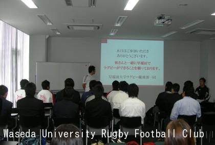 まずは創部90周年記念DVDの鑑賞に始まった開講式で、勝田譲(スクール統括)が思いの丈をすべてぶつけた。「無私の奉仕」「無功徳」から発足したワセダ歴史。『赤黒』『荒ぶる』、絶対的なふたつの指針。緊張、創造、継承。今年のビジョン…。さらには辻監督、有田主将からのメッセージ。「ワセダには夢を叶える環境、組織、情熱を持った人間がたくさんいます。一緒に日本一を目指しましょう!」