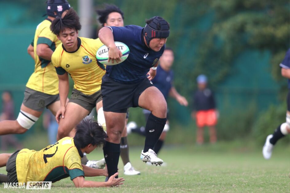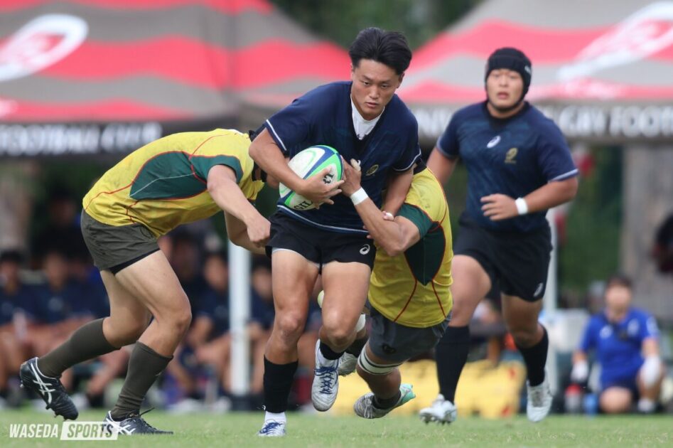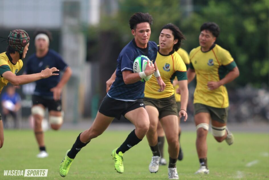 30分には寺田がインゴールに飛び込んだが、35分についに失点。ブラインドサイドの数的優位を突かれた。しかし早大DはCTB山口滉太郎(教1=東京・早実)を軸に攻撃を継続し、狭いサイドにSH日向寺堪大(文構1=福島・磐城)とSO古瀬莊(スポ1=静岡聖光学院)が仕掛けた。少ない手数でトライを奪い返し、前半は45-7で終えた。