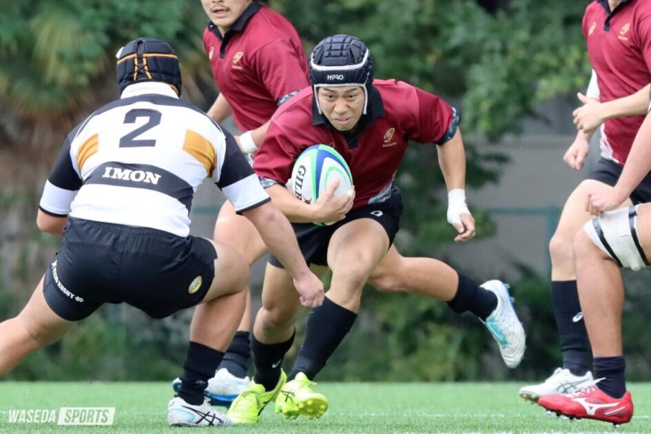 早大Bは前節の慶大B戦で終始圧倒し、合計11トライの猛攻で3連勝を収めた。早大Bは試合開始早々、敵陣ゴール前のラインアウトを獲得するとモールからHO杉村利朗(社2=東福岡)がトライラインをたたき割り、先制に成功する。その後もFWとBKが多彩なアタックで得点を積み重ね、33-0と差を広げる。しかし前半の終盤にはターンオーバーからディフェンスラインを整えきれずトライを許し、折り返す。