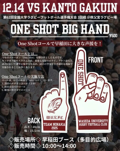 明日14日(日)秩父宮ラグビー場で開催される、大学選手権 3回戦関東学院大学戦でも、One Shotビッグハンドを販売いたします!