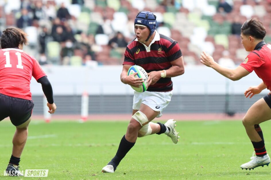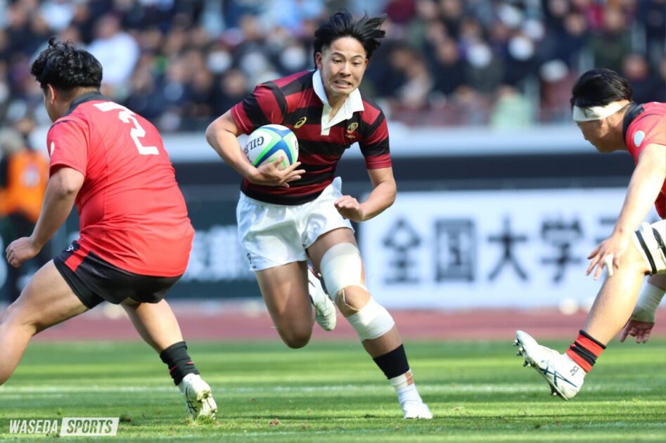 「限られた好機を確実にものにし勝ち切る。 選手、スタッフ、サポーターが一体となり、同じ方向を見据え続ける。」 ノックアウトステージである全国大学ラグビーフットボール選手権準決勝は、その言葉が示す意味を体現した一戦だった。『One Shotコール』と『早稲田コール』が響きわたる国立競技場。緊迫した中、試合が幕を開けた。開始早々、早大は連続フェーズからSO服部亮太(スポ2=佐賀工)が一瞬の隙をつく鋭いランからディフェンスを切り裂き、先制点を奪った。しかし、試合巧者の帝京大が反撃の狼煙をあげる。早大は続けざまに2トライを許し、追う展開に。それでも早大は冷静なゲームメイクを見せる。服部のキックから試合を組み立て、追加点。ペナルティーゴールと服部のドロップゴールで着実に得点を重ね、23-14で試合を折り返した。